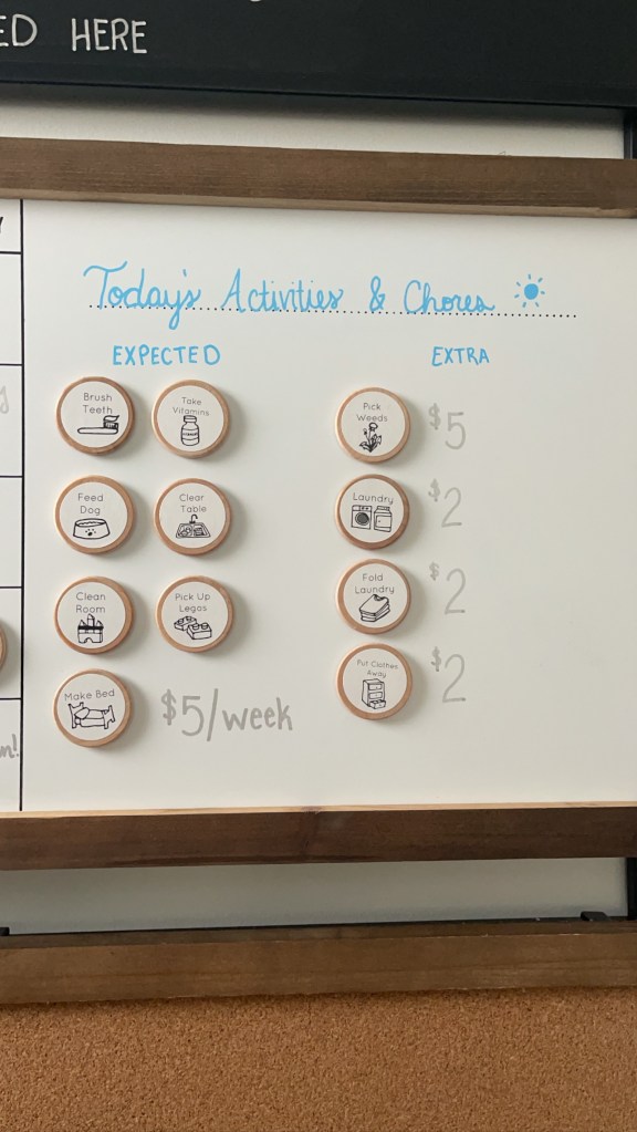 Deciding what type of allowance to do for your kids is tough. There are some things that I decided are tasks that we simply do because we are a family. He brushes his teeth, feeds the dog, clears the table, and cleans his room without monetary value for each of them. However, we are a team and at the end of the week if he has consistently done those things and been part of the team, he will get his weekly allowance.