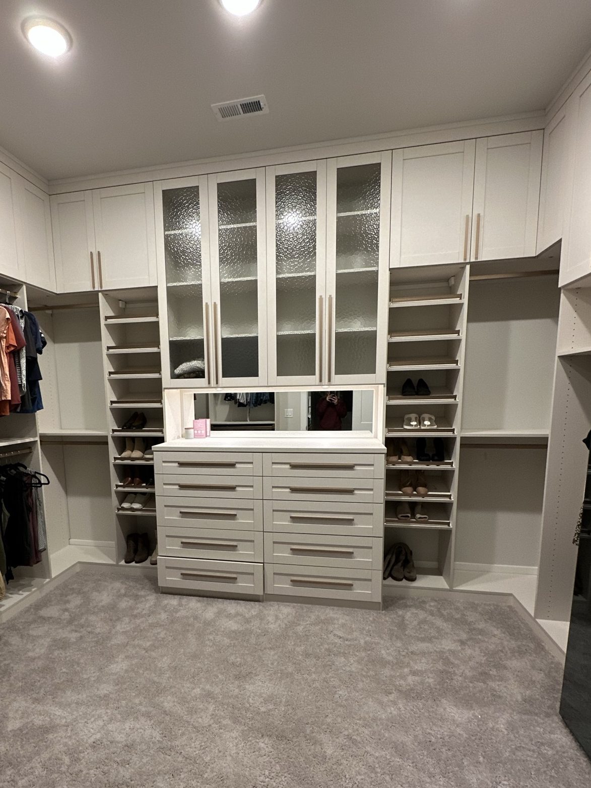 - Luxury – I wanted to do this once and be done and was willing to work for it. The closet has soft close drawers and doors, a little built-in lighting and I upgraded the wood to have a linen texture. The gold pulls were the icing on the closet.